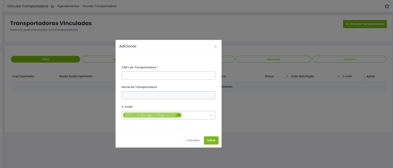 A funcionalidade de Vinculação de Transportadora estabelece um vínculo formal entre exportadores e transportadoras autorizadas, garantindo que os agendamentos de exportação sejam realizados somente com empresas devidamente aprovadas.
