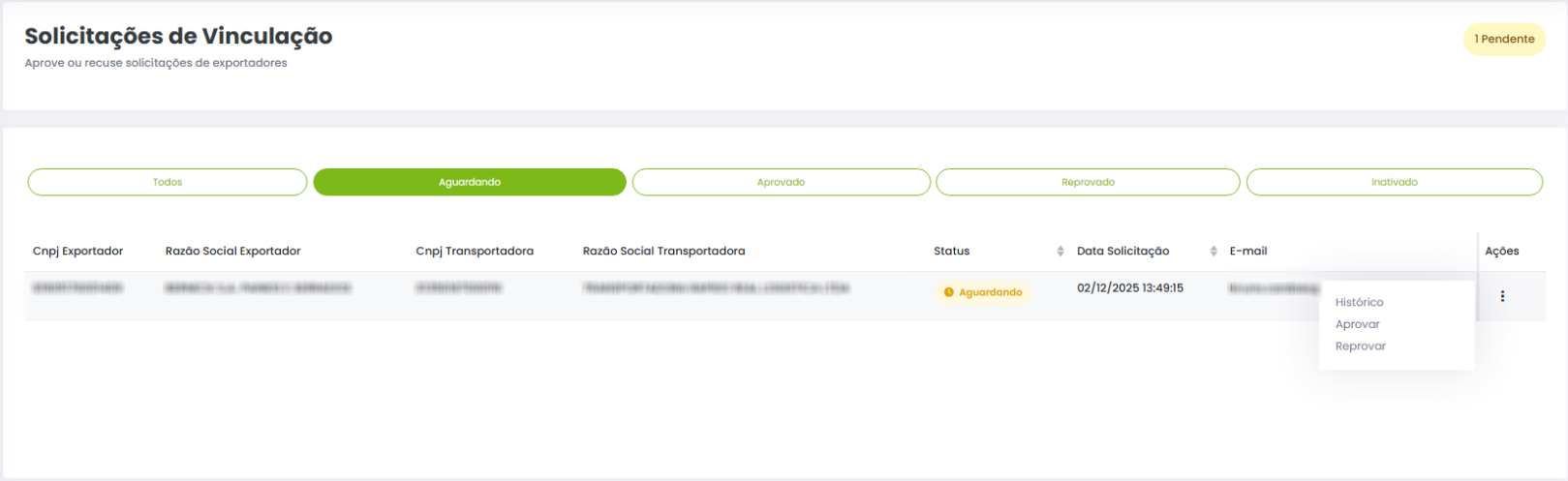 Ao acessar o portal, a transportadora verá notificações de novos pedidos de vinculação.