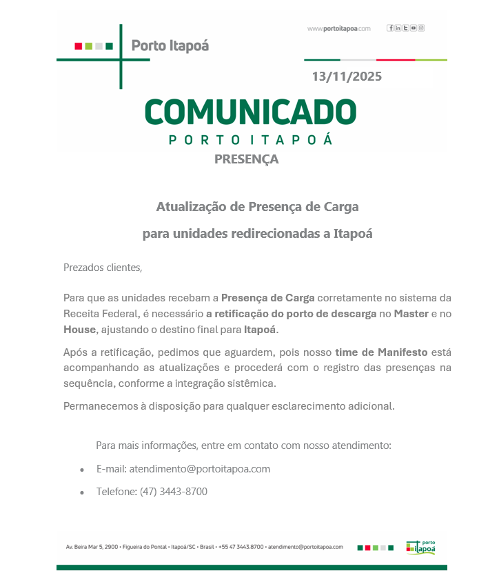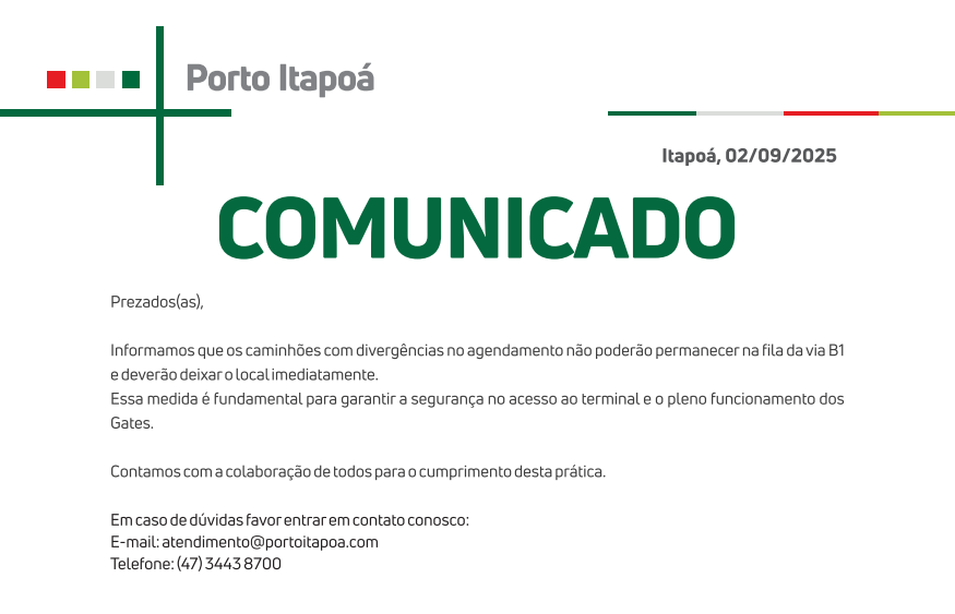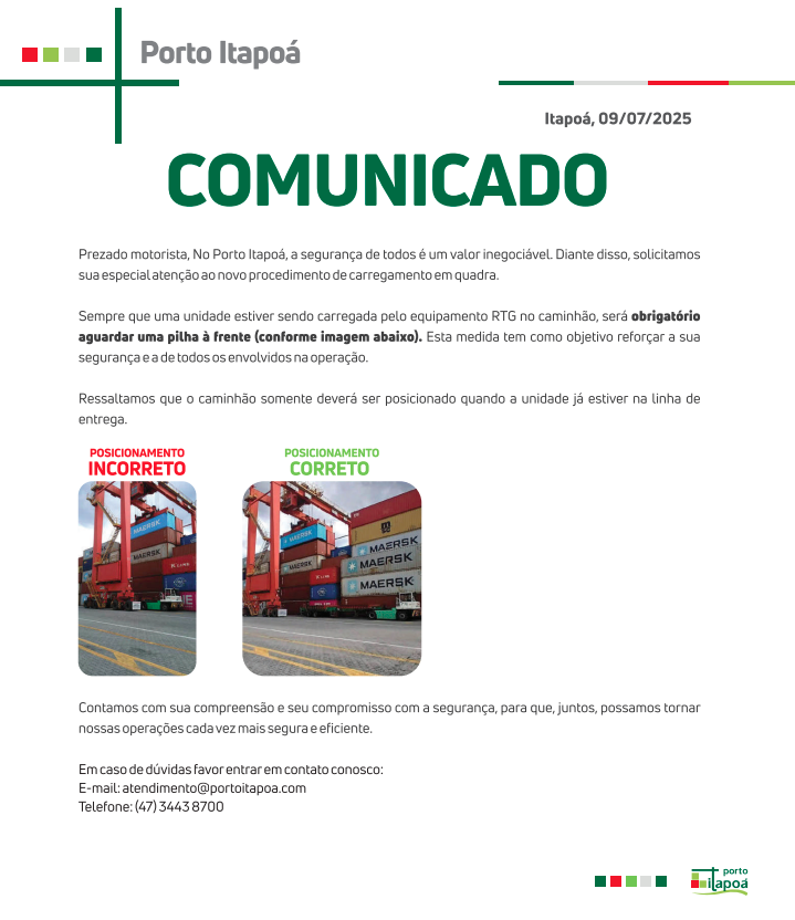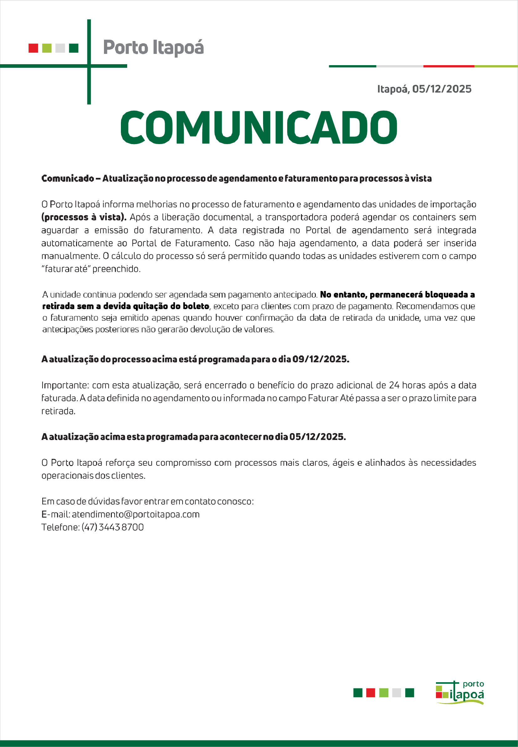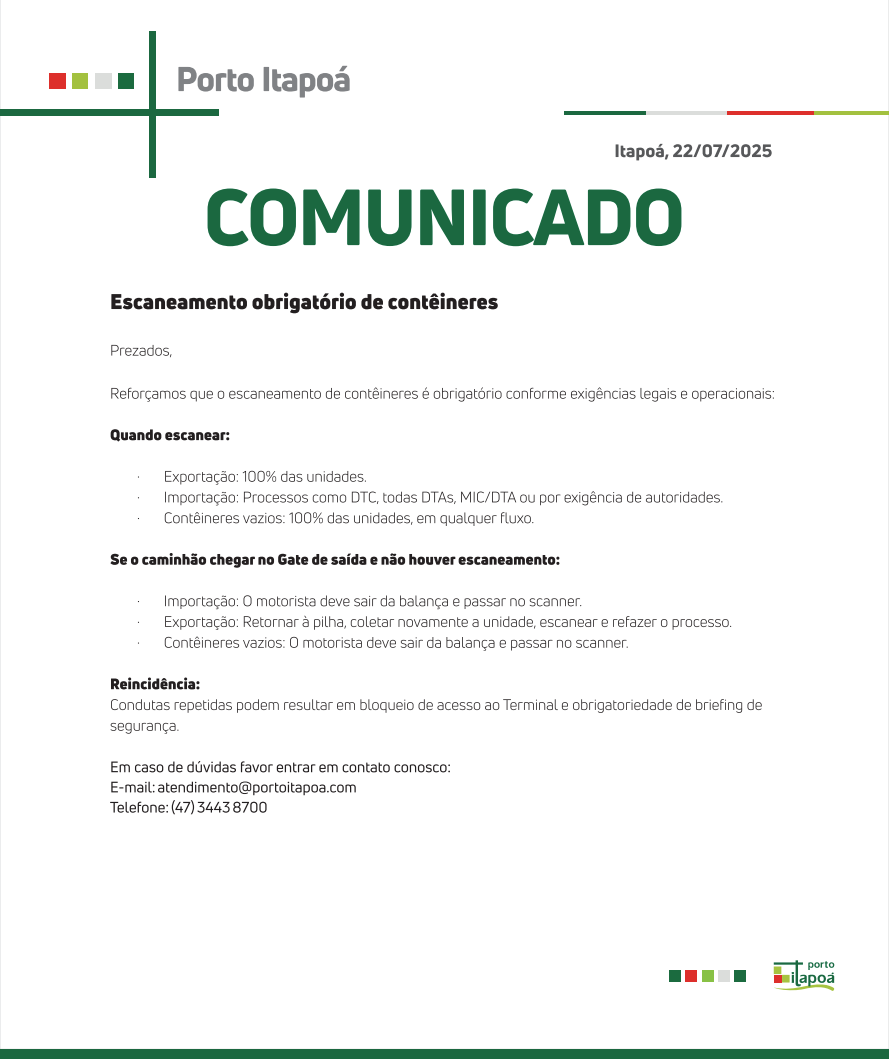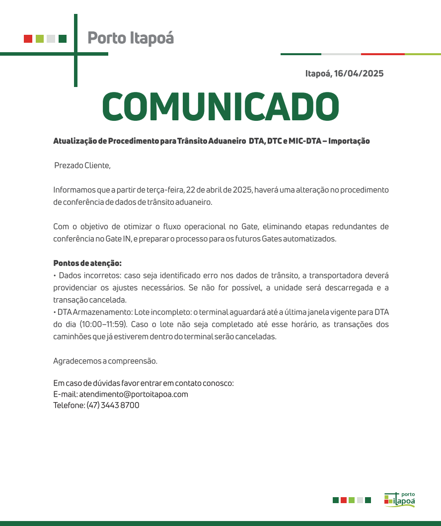 Em cumprimento à determinação da Receita Federal do Brasil (RFB), a partir de 12/05/2025, todos os containers de importação sob regime de trânsito MIC/DTA deverão ser lacrados antes da saída do terminal.