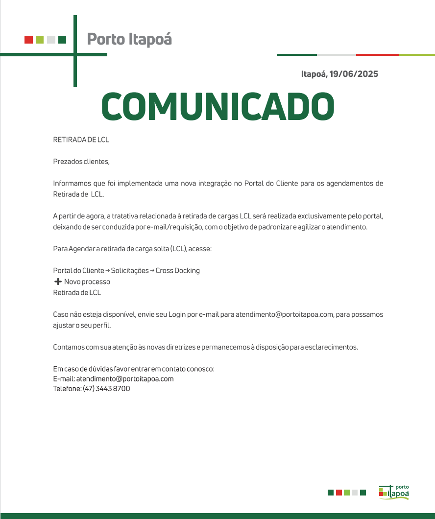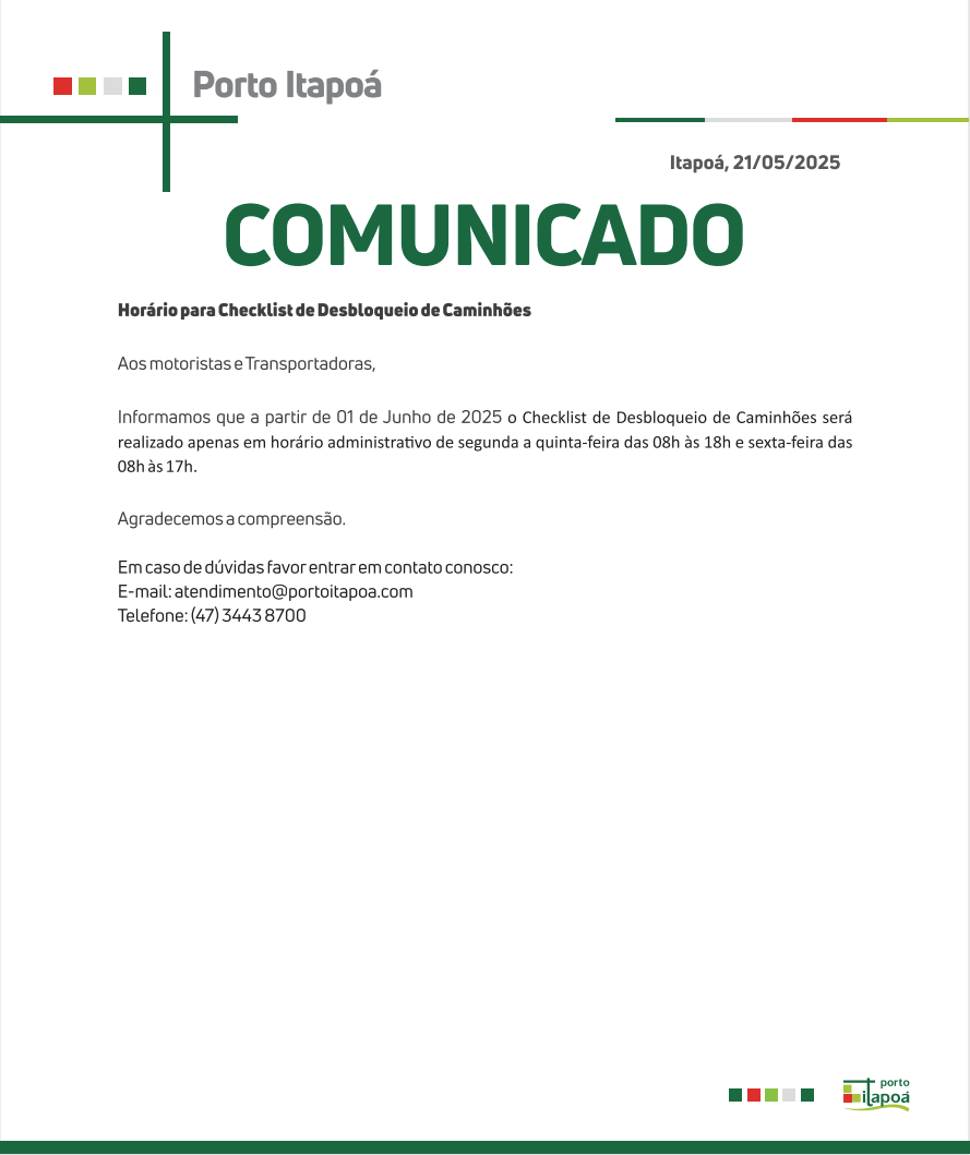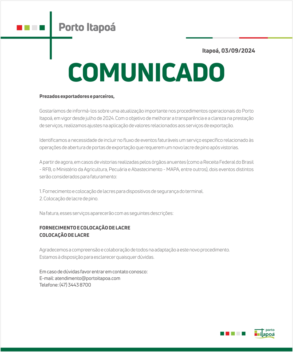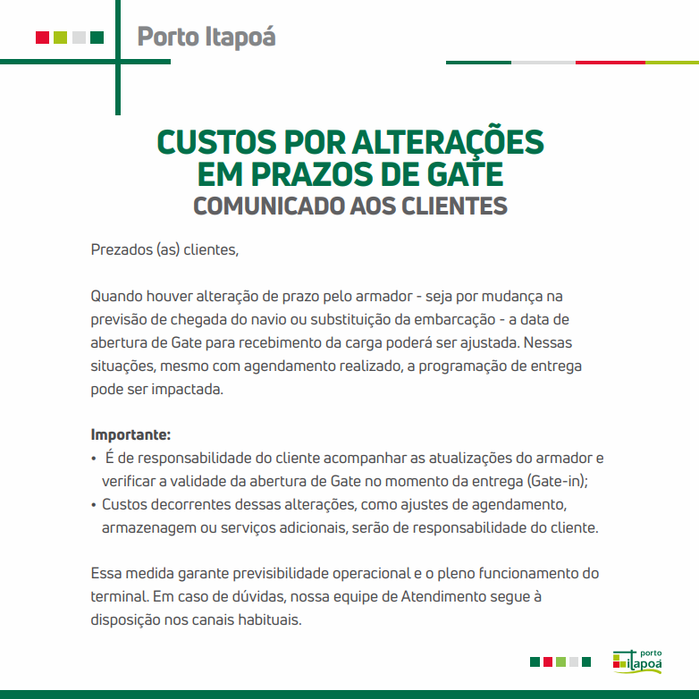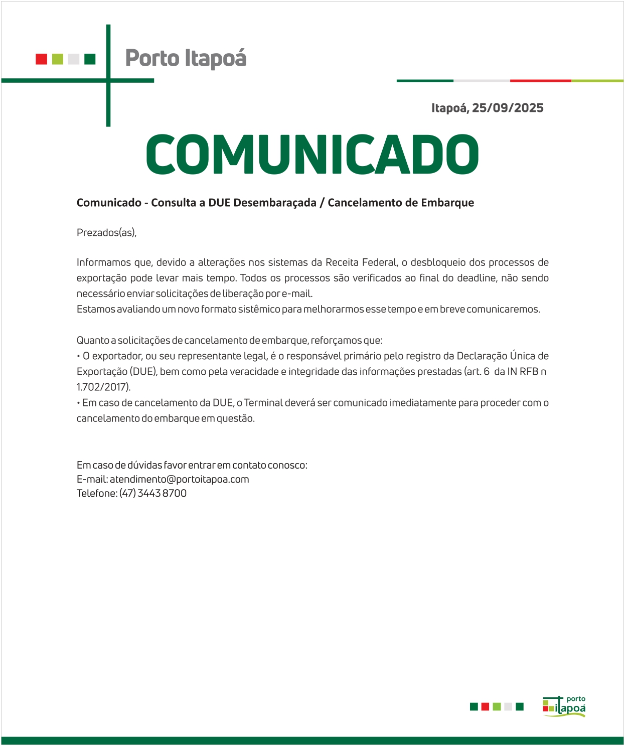 Em cumprimento à determinação da Receita Federal do Brasil (RFB), a partir de 12/05/2025, todos os containers de importação sob regime de trânsito MIC/DTA deverão ser lacrados antes da saída do terminal.