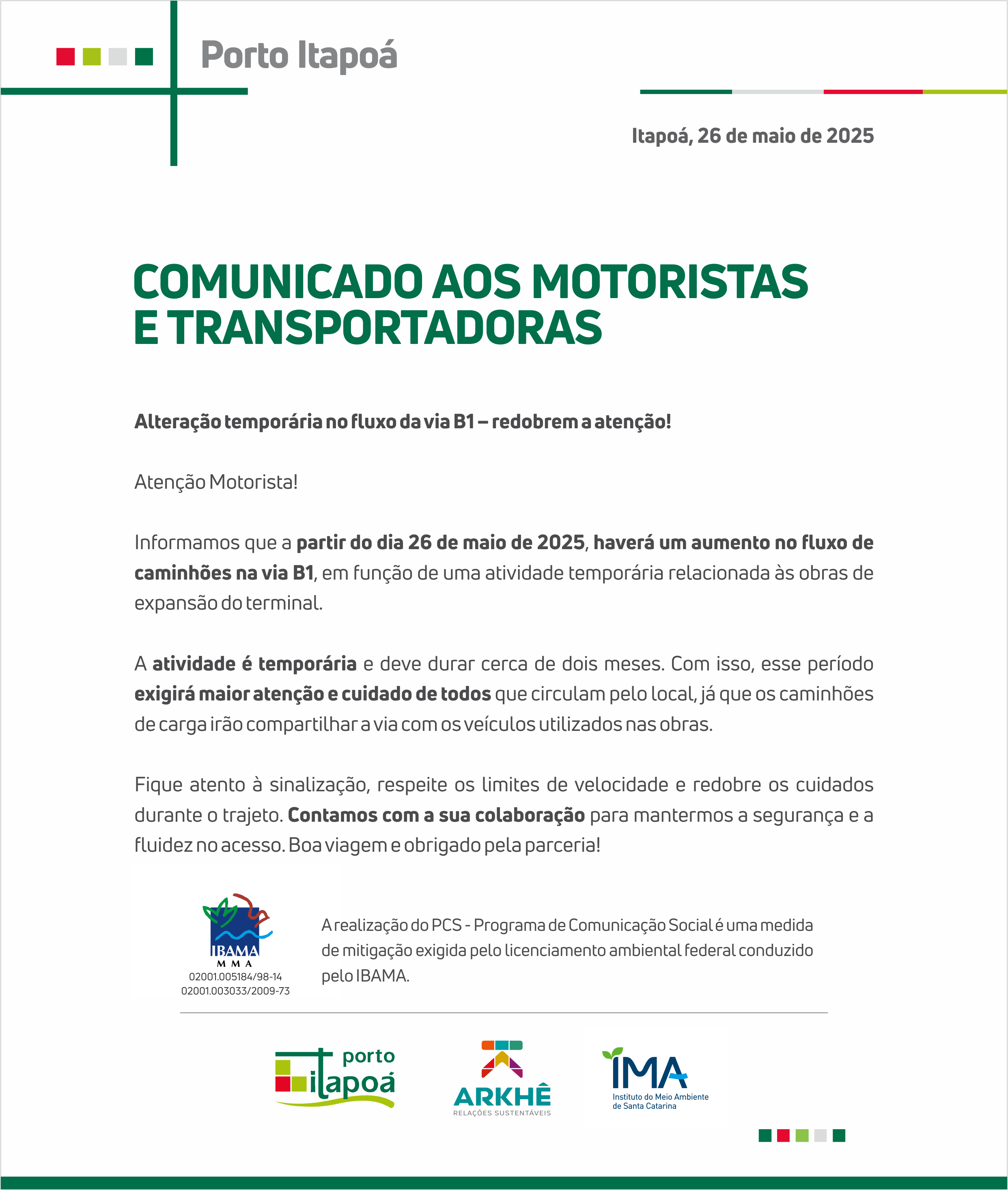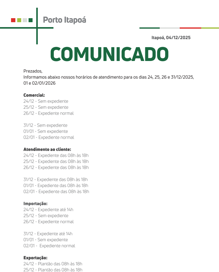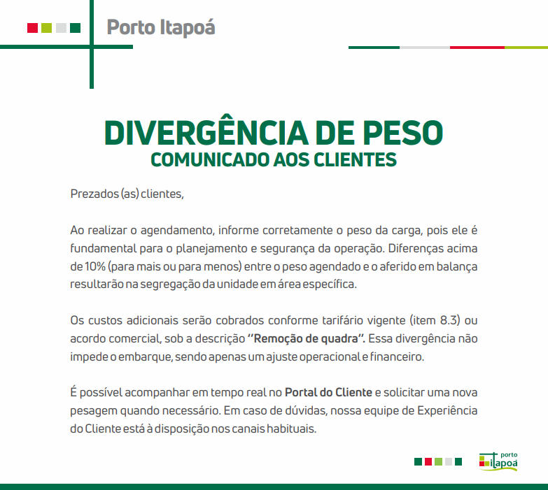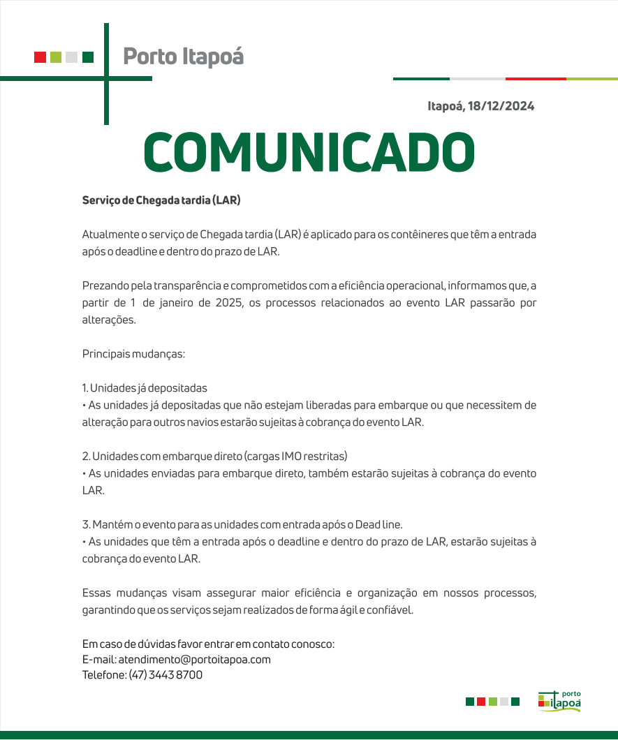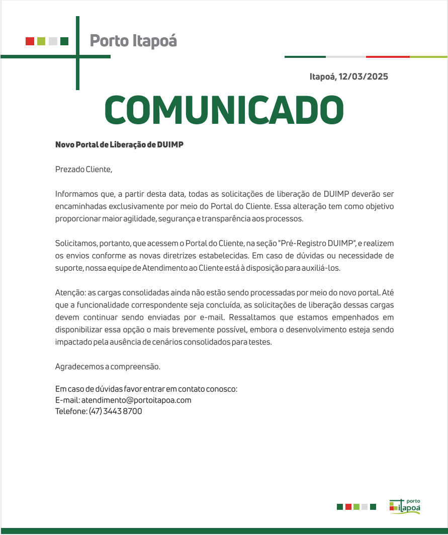 Em cumprimento à determinação da Receita Federal do Brasil (RFB), a partir de 12/05/2025, todos os containers de importação sob regime de trânsito MIC/DTA deverão ser lacrados antes da saída do terminal.